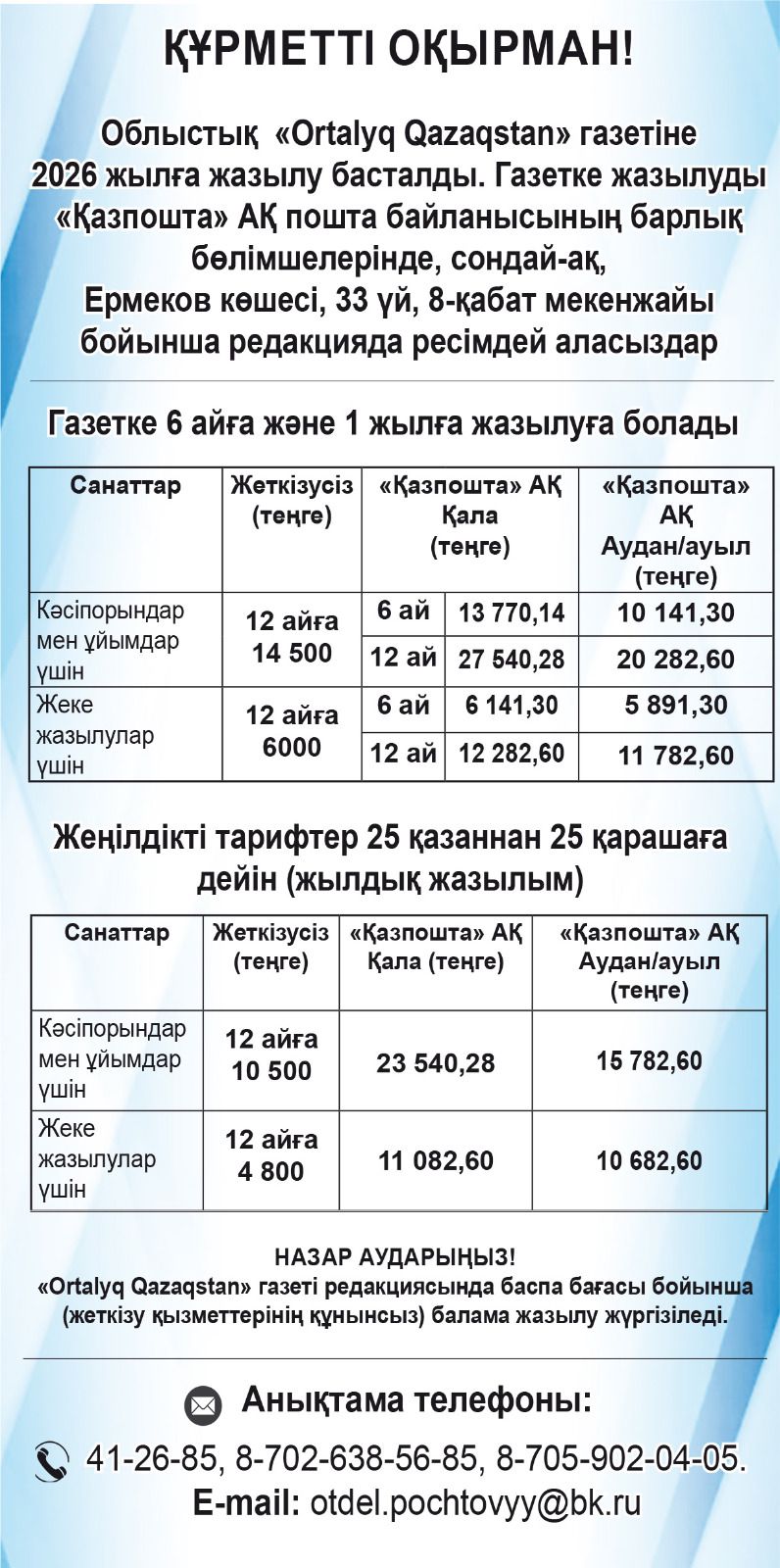 Құрметті оқырман! Облыстық «Ortalyq Qazaqstan» газетіне 2026 жылға жазылу науқаны жалғасуда. Газетке «Kaspi.kz» қосымшасының QR-коды арқылы жазыла аласыздар.