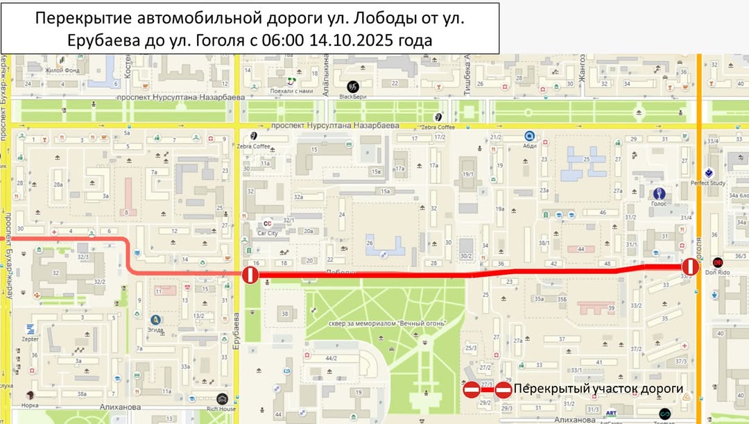 Жол–құрылыс жұмыстарын жүргізу үшін Ерубаев көшесінен Гоголь көшесіне дейінгі учаске жабылды. Онда орташа жөндеу жұмыстары жүргізілуде.