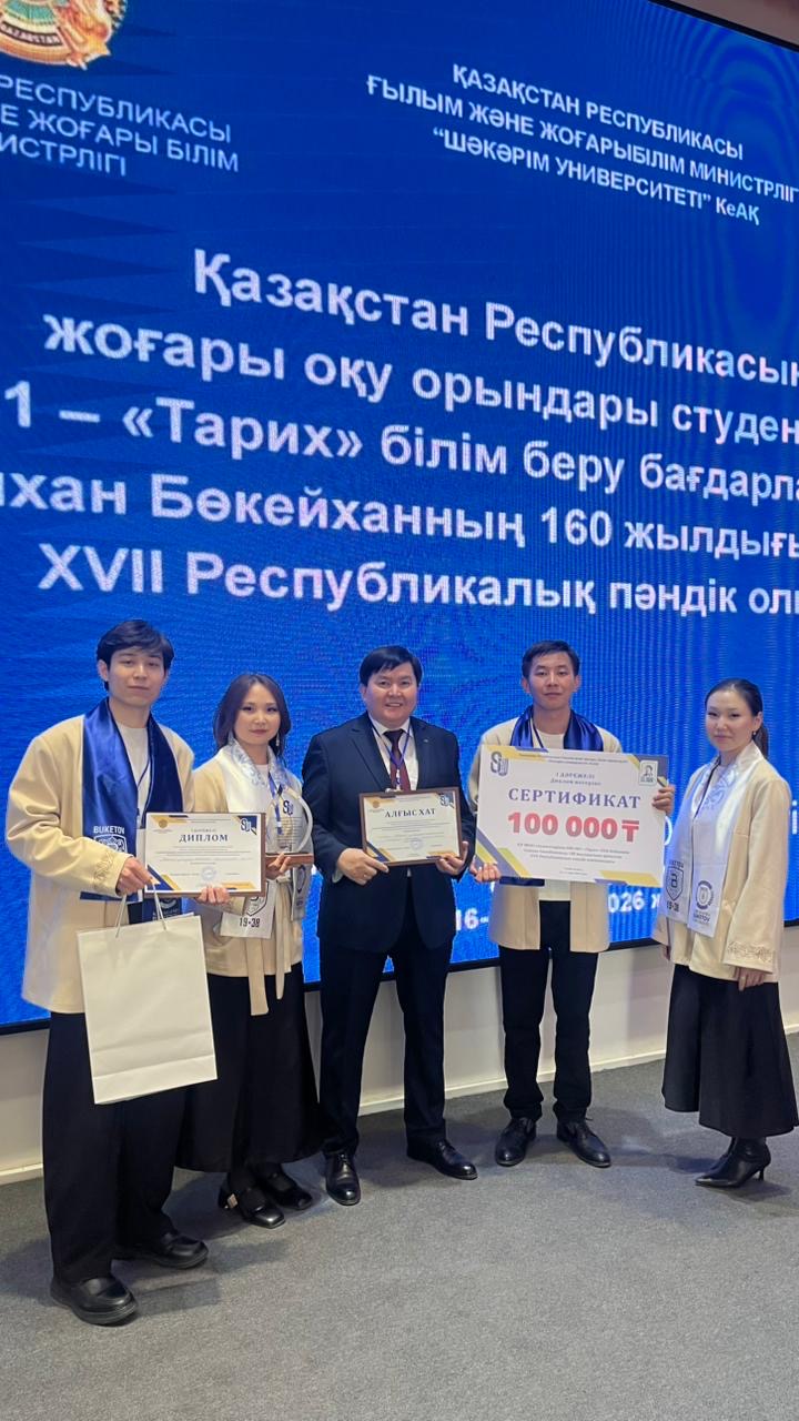 Елімізде жыл сайын дәстүрлі түрде жоғары оқу орындары арасында өтетін пәндік олимпиадалардың жөні бөлек. Биыл Алаш астанасы Семейде Ұлт көсемі Әлихан Бөкейханның 160 жылдығына орай ұйымдастырылған XVII республикалық пәндік олимпиадада аймақ намысын ту еткен тарихшы студенттеріміз І орынды қанжығаға байлады. «Алаш һәм Алашорда: мемлекеттілік үшін күрес» тақырыбын қаузаған бұл білім бәйгесінде тарихшы жастардың танымы мен талдау қабілетін таразыға салынды.