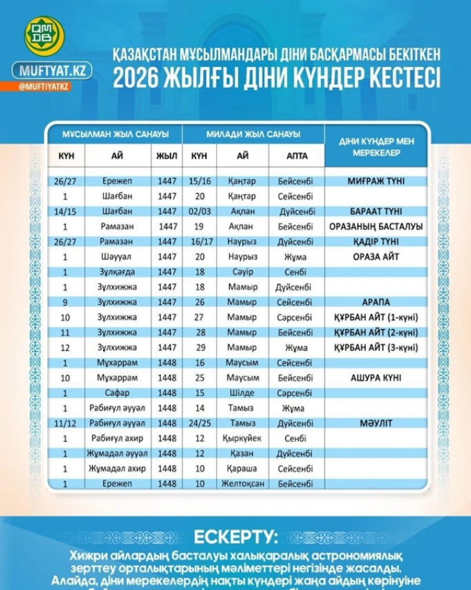 Қазақстан мұсылмандары діни басқармасының (ҚМДБ) мәліметінше, биылғы Ораза ұстау (қасиетті Рамазан айының бірінші күні) 19 ақпанда басталады, Қадір түні – 16-нан 17 наурызға қараған түні өтеді, ал Ораза айт мейрамын мұсылмандар 20 наурызда атап өтеді.