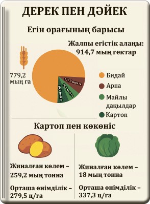 – Картоп бойынша орташа өнімділік гектарына 253,7 центнерді құрап, жалпы 271,3 мың тонна өнім жиналады деп болжанады. Көкөністерден 38,8 мың тонна өнім алынады. Жиын-терім науқанына 1976 астық жинайтын комбайн, 220 картоп жинайтын комбайн және 162 картоп қазғыш жұмылдырылды. 3 000-нан астам техника өнімді алқаптан тасымалдап, алғашқы өңдеу жұмыстарына жегілді. Алдын ала есеп бойынша астық жинау жұмыстары 24 жұмыс күні ішінде, картоп жинау 22 күн ішінде аяқталады деп жоспарлануда, – деп хабарлады облыстық ауыл шаруашылығы және жер қатынастары басқармасының басшысы Ануар Тюлюбеков.