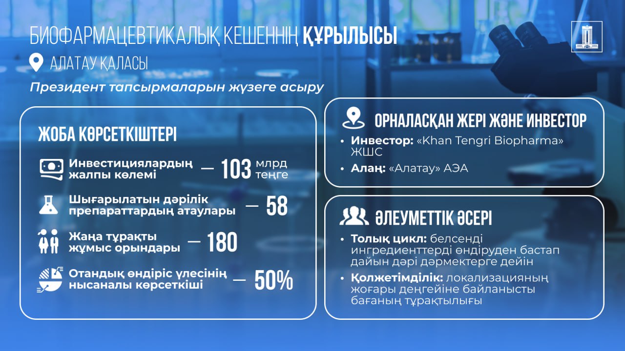 Құжатта ҚР Денсаулық сақтау министрлігі мен «Khan Tengri Biopharma» ЖШС арасындағы «Алатау» арнайы экономикалық аймағында заманауи «Биофармацевтикалық толық циклді кешен салу» жөніндегі инвестициялар туралы келісім жобасы мақұлданды.