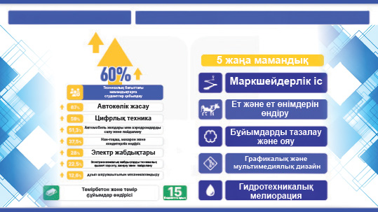 Сонымен қатар, 2026 жылы болашақтың құзыреттерін қалыптастыратын бес жаңа мамандық ашу жоспарлануда: маркшейдерлік іс, ет және ет өнімдерін өндіру, бұйымдарды химиялық тазалау және бояу, графикалық және мультимедиялық дизайн, гидротехникалық мелиорация.