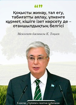 Мемлекет басшысы Қасым-Жомарт Тоқаев қоғамда экологиялық мәдениет пен азаматтық жауапкершілікті қалыптастырудың маңыздылығына ерекше назар аударды. Президенттің айтуынша, қоқысты жинау, тал егу, табиғатты аялау, үлкенге құрмет көрсетіп, кішіге ізет таныту – отаншылдықтың нақты көрінісі.