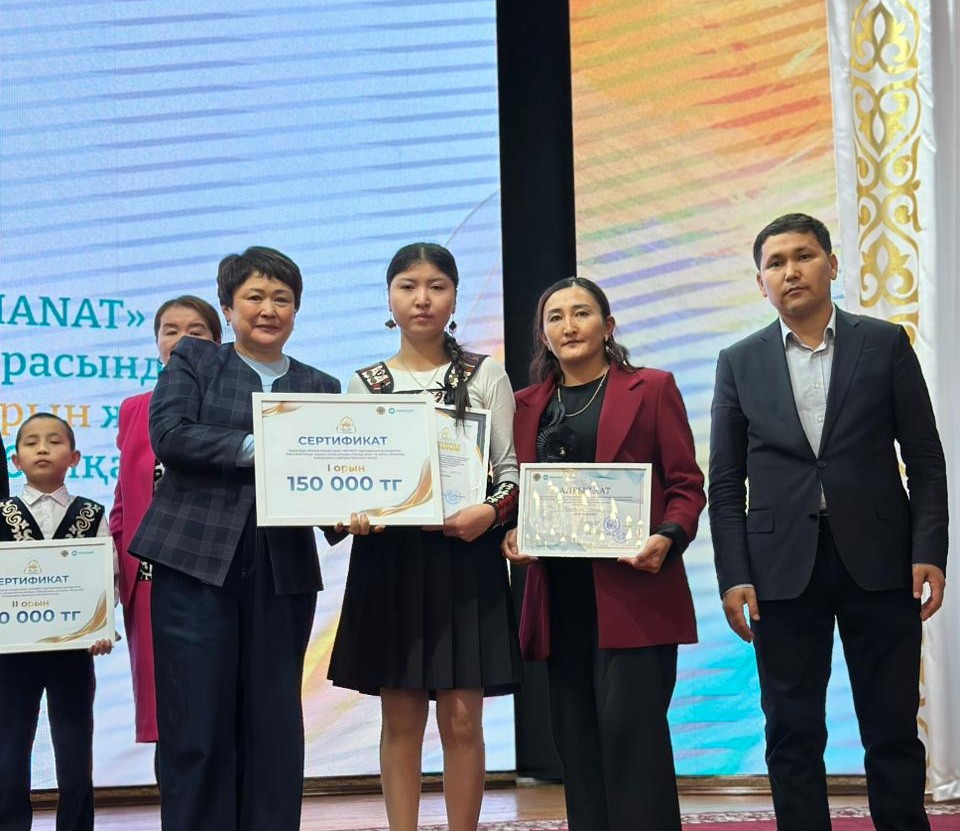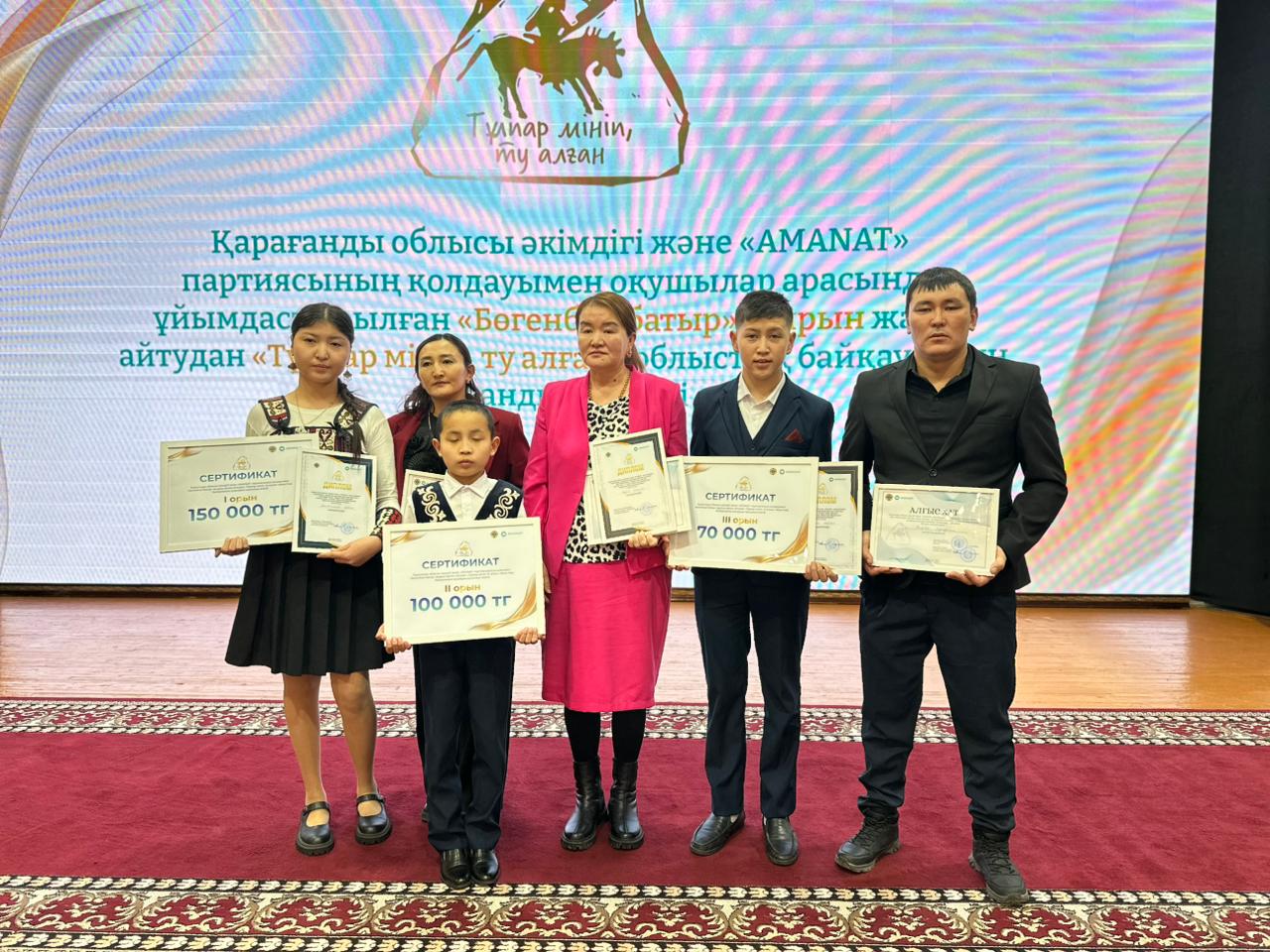 1 орын (150 мың теңге) – Ә.Бөкейхан атындағы тірек мектебі оқушысы Ақбота Асылболатқызы, дайындаған мұғалімі – Жанар Түсіпбекова.