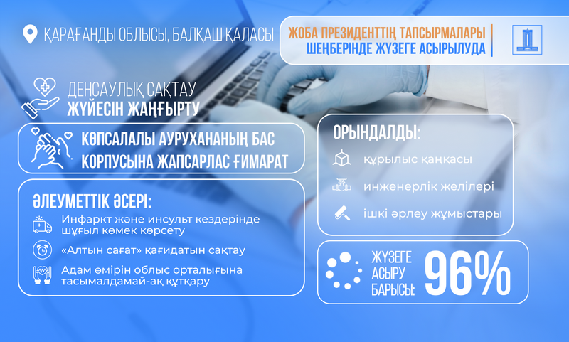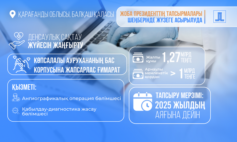 Балқаш қаласында қазіргі уақытта күрделі жөндеу жүргізіліп жатқан көпбейінді аурухана базасында ауданаралық медициналық хаб құрылады. Бұл мақсаттарға 1 млрд теңгеден астам қаржы бөлінді, жалпы құны 1,27 млрд теңгені құрайды. Жоба аясында ангиографиялық операциялық және қабылдау-диагностикалық бөлімшелерді орналастыру үшін қосымша корпустың құрылысы аяқталуда. Бүгінгі таңда нысан 96%-ға дайын. Сондай-ақ қаңқаны салу, инженерлік желілерді төсеу және ішкі әрлеу бойынша негізгі жұмыстар аяқталды. Нысанды осы жылдың соңына дейін тапсыру жоспарланған.