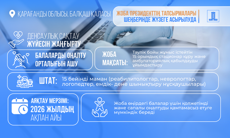 Сонымен қатар Балқашта балаларды оңалту орталығы құрылуда: бұрынғы санаторий ғимаратын қайта жабдықтау үшін 272,1 млн теңге бағытталды. Жоба стационар және амбулаториялық қабылдауды ұйымдастыруды көздейді. Реабилитологтарды, невропатологтарды, логопедтерді және ЕДШ нұсқаушыларын қоса алғанда, тар бейінді мамандардан тұратын көпсалалы команда құрылады. Бұл балаларға облыс орталығына бармай-ақ сапалы оңалтуға қол жеткізуді қамтамасыз етеді. Жұмыстарды аяқтау 2026 жылдың ақпан айына жоспарлануда.