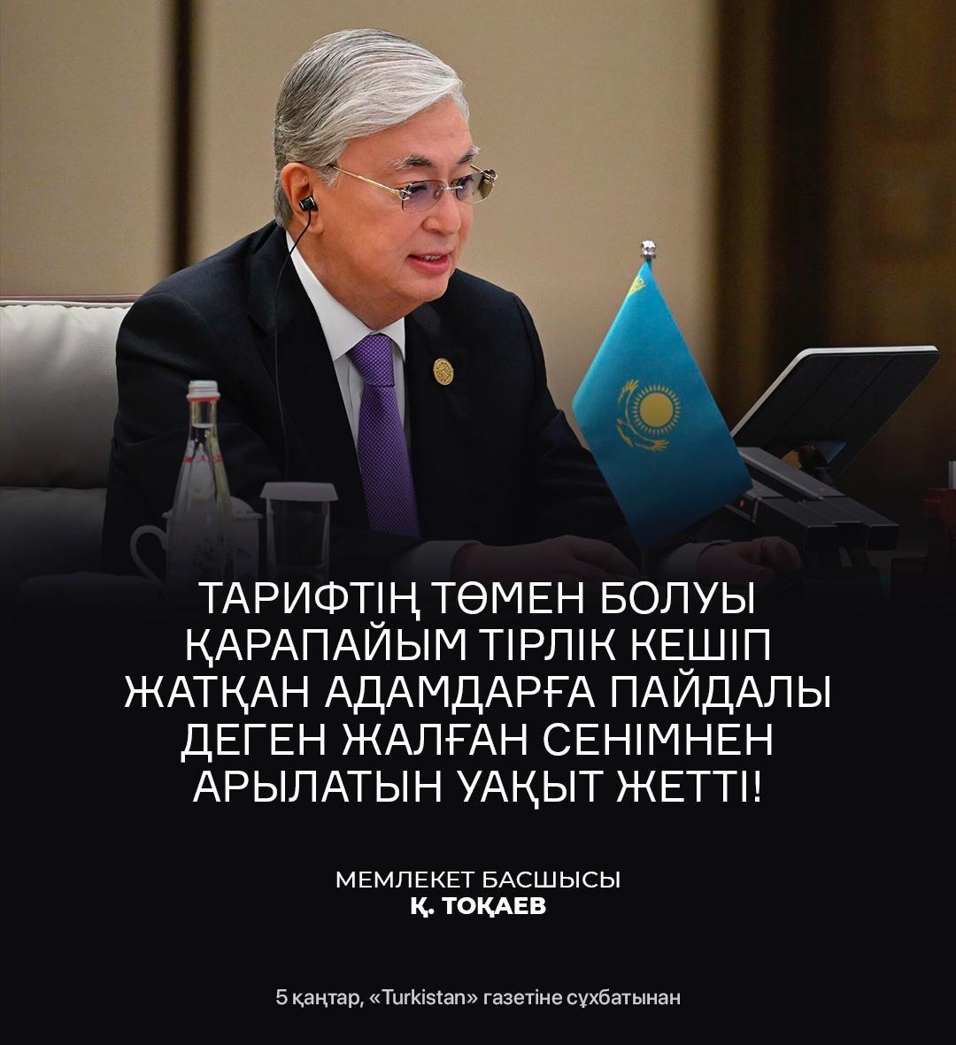 Мемлекет басшысы Қасым-Жомарт Тоқаев тариф саясатына қатысты қоғамда қалыптасқан қате түсінікке назар аударды. Президенттің айтуынша, тарифтің төмен болуы қарапайым халыққа автоматты түрде пайда әкеледі деген сенімнен арылатын уақыт жетті.