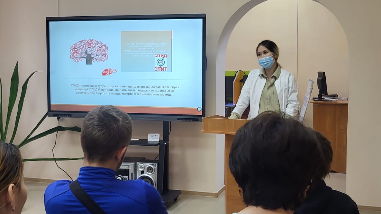 Студенттер алдында медицина қызметкері Зарина Жанатқызы сөйлеп, осы ғасыр дертінің пайда болуы, оны жұқтыру механизмі мен аурудың алдын алу жолдары жайлы айтты. Ол осыған байланысты мысалдар келтіріп, аурудың психологиялық және әлеуметтік салдарларын сөз етіп, жастардың індетпен күрестегі ролін атап өтті.