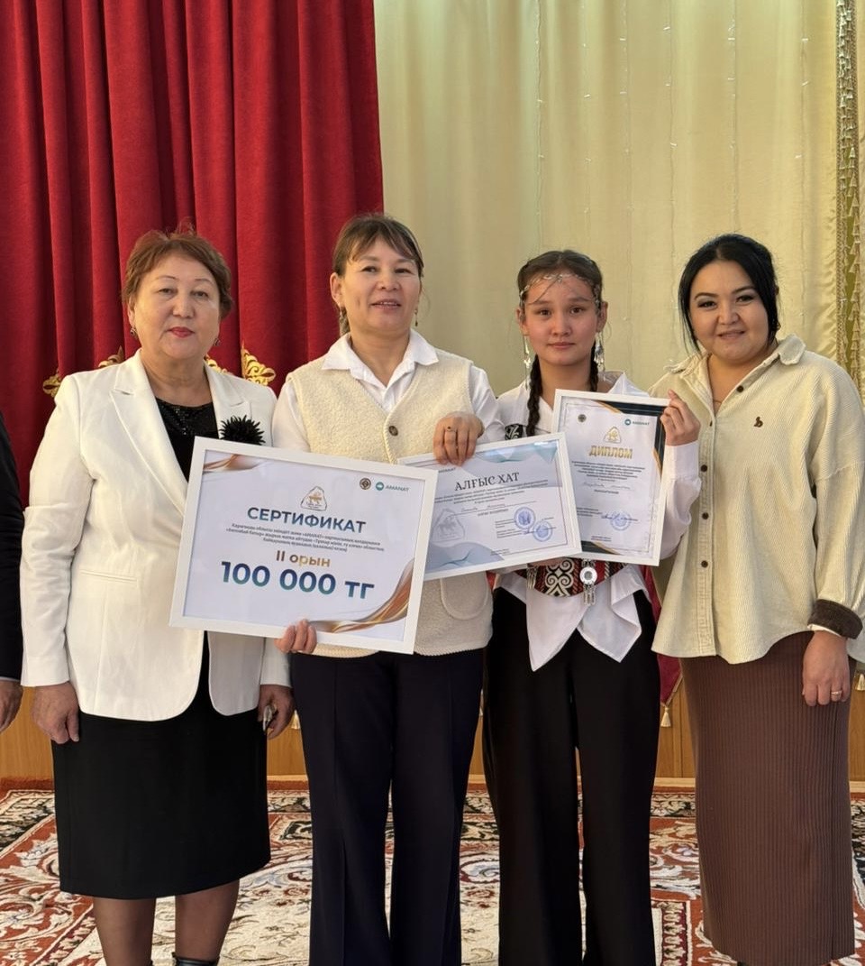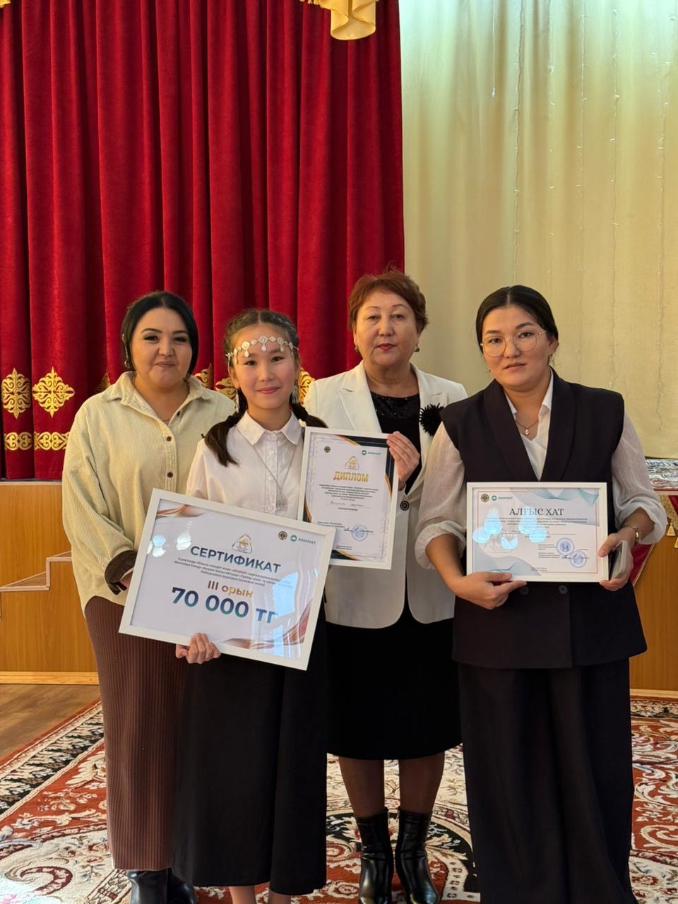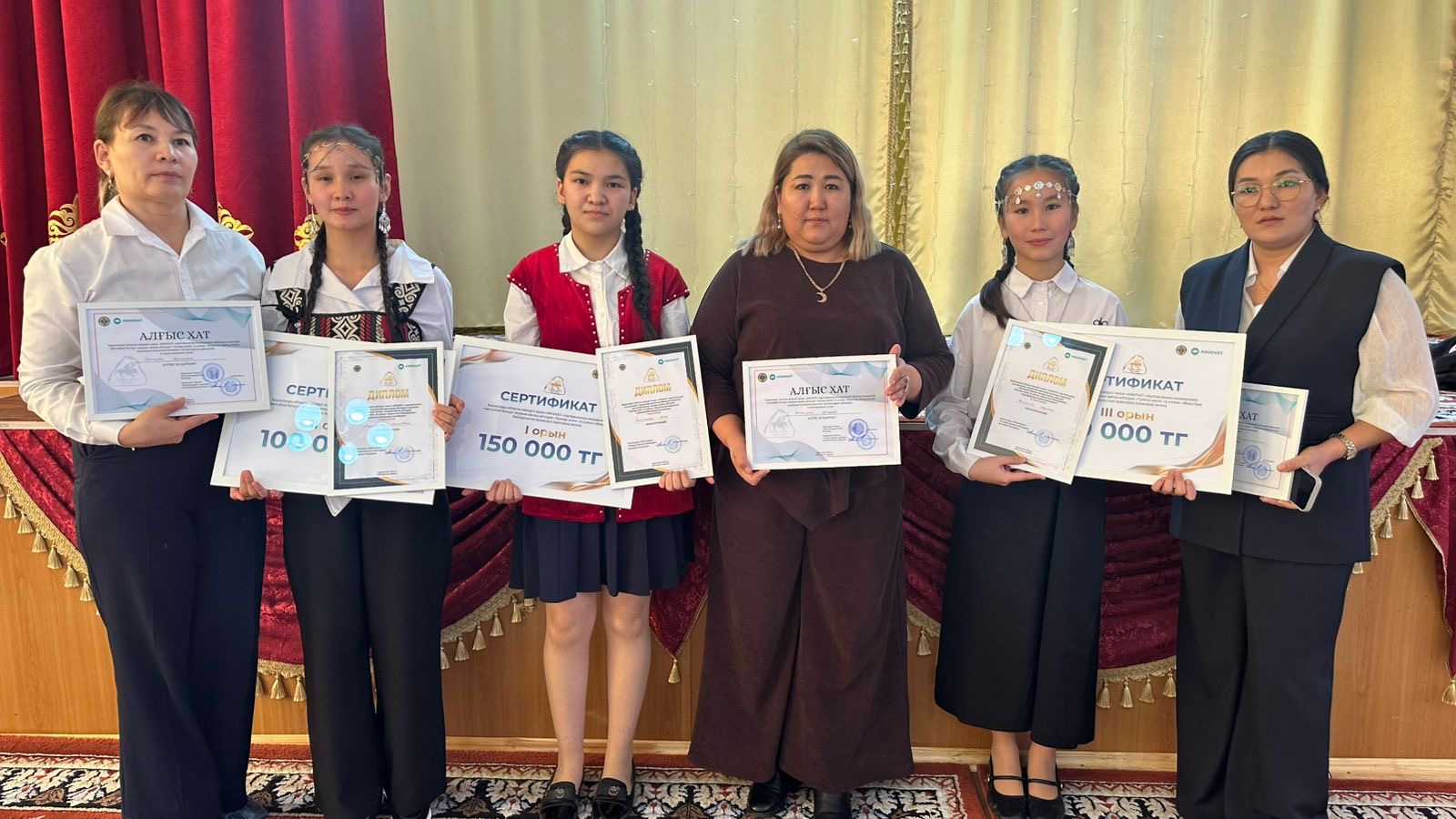 1 орын (150 мың теңге) – М.Мақатаев атындағы мектеп оқушысы Анар Елемесқызы, дайындаған мұғалімі – Айнұр Хабылхай.
