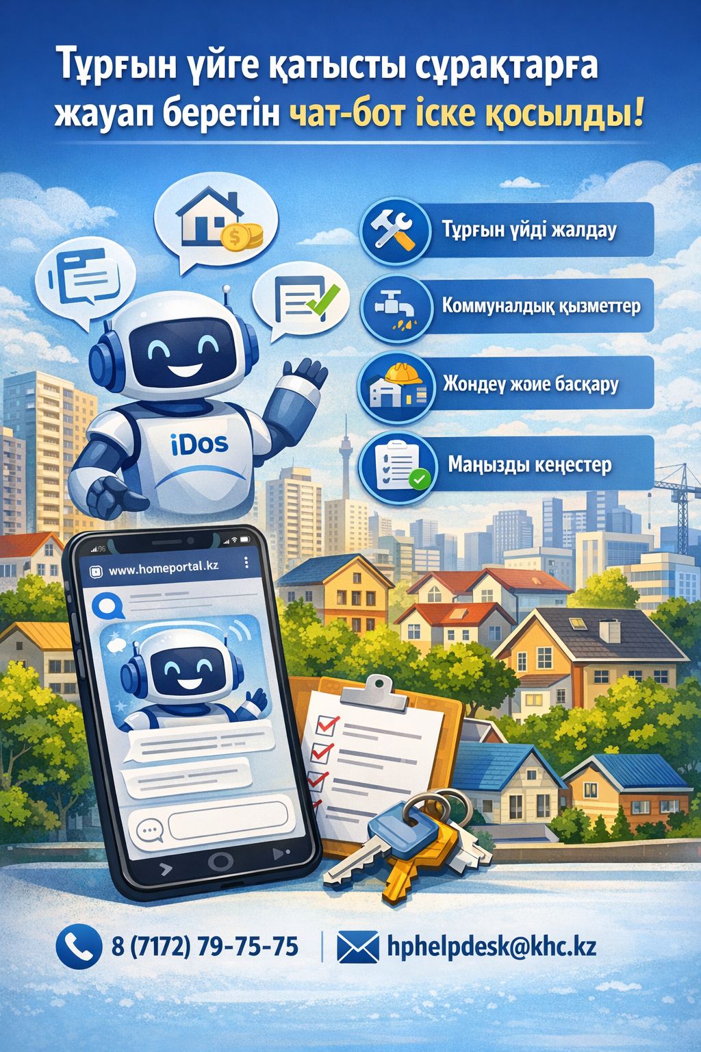 iDos жалға берілетін тұрғын үй, коммуналдық қызметтер, үйді басқару және жөндеу жұмыстарына қатысты сұрақтарға жауап береді. Атап айтқанда, чат-бот арқылы: