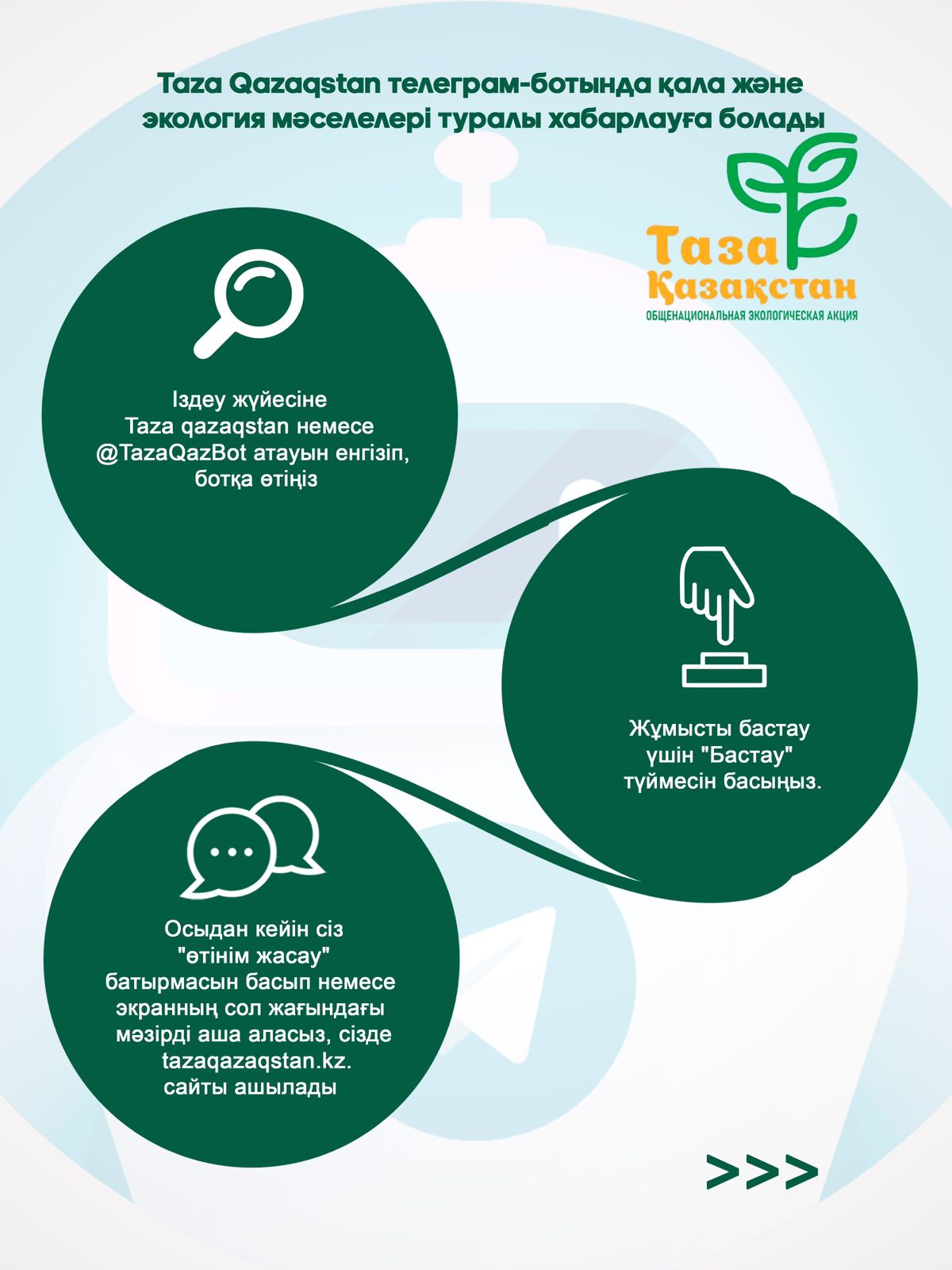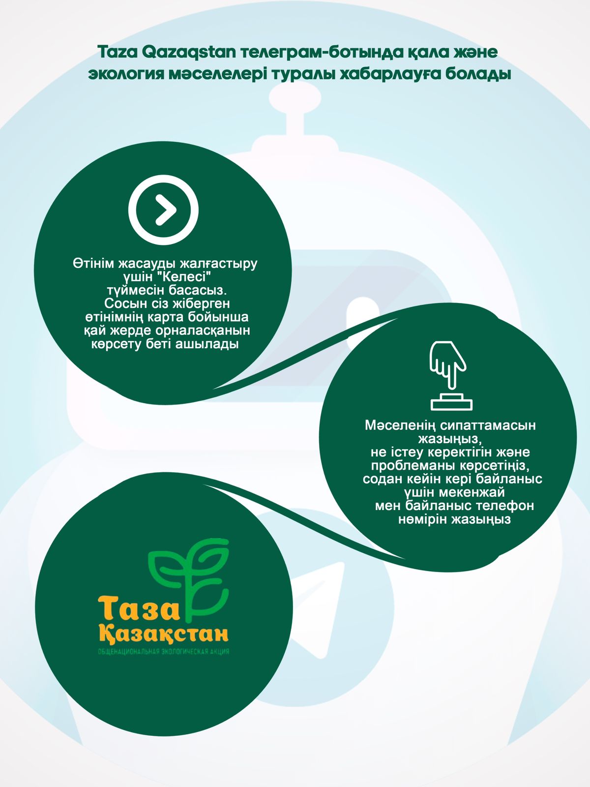 Экология және табиғи ресурстар министрлігі «Таза Қазақстан» ауқымды акциясы аясында @TazaQazBot телеграм-чат-ботын іске қосты. Бұл сервис азаматтарға өз өңіріндегі экологиялық және инфрақұрылымдық мәселелер туралы оңай хабарлауға мүмкіндік береді.