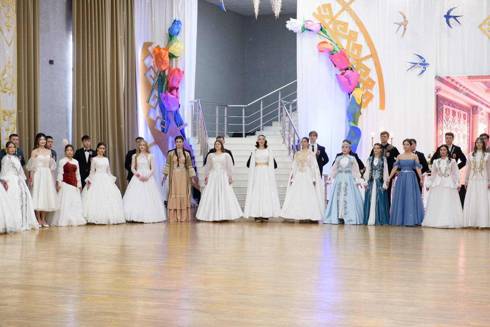 Қыздар қазақтың ұлттық ою-өрнек элементтері бар стильдендірілген ақ немесе ашық түсті бал көйлектерін киіп, ұлттық әшекейлермен толықтырды, ал жігіттер қазақтың ұлттық ою-өрнек элементтері бар стильдендірілген костюмдерде өнер көрсетті.
