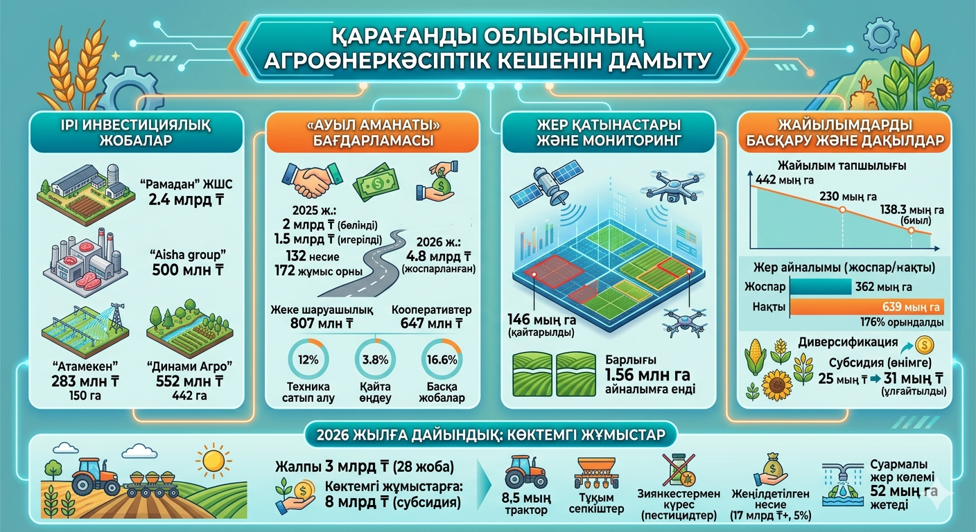 Жалпы, құны 3 млрд теңгені құрайтын 28 жобаны жүзеге асыру көзделуде, оның ішінде, ірі тауарлы өндірістерді дамытуға бағытталған бастамалар бар. Алдағы негізгі мақсаттың бірі – көктемгі дала жұмыстарына сапалы дайындық жүргізу. Егістікті зиянкестерден қорғау үшін қажетті пестицидтер сатып алынды. Суармалы жер көлемі 6,2 мың гектарға ұлғайып, 52 мың гектарға жетеді. Техника дайындығы да жоғары деңгейде, 8,5 мың трактор, жүздеген егіс кешендері мен мыңдаған тұқым сепкіштер жұмылдырылады.