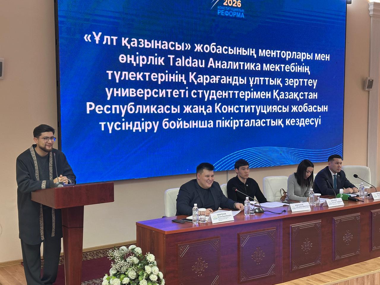 «Ұлт қазынасы» республикалық жобасының тәлімгерлері мен Taldau өңірлік талдамалық мектебінің түлектері Е.Бөкетов атындағы ҚарҰЗУ-де студенттермен дискуссиялық кездесу өткізді. Кездесуде Қазақстан Республикасының жаңа Конституциясы жобасының негізгі бағыттары түсіндіріліп, жастармен ашық диалог жасалды.